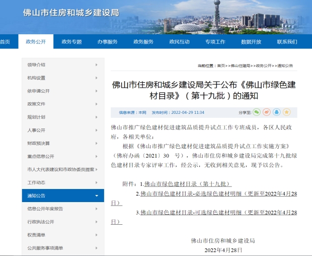 佛山市住房和城乡建设局关于公布《佛山市绿色建材目录》(第十九批)的通知