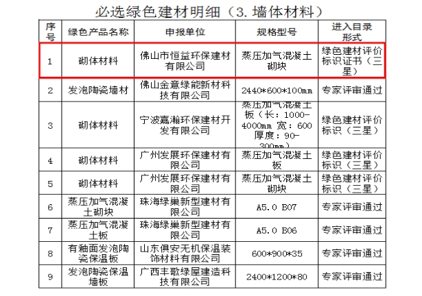 经过专家组多重评审,恒益环保建材公司生产的蒸压加气混凝土砌块顺利通过由佛山市住房和城乡建设局牵头开展的绿色建材目录专家评审。恒益环保建材公司2019年已获得国家级绿色建材三星等级评价标识证书,助推本次评审工作顺利通过。