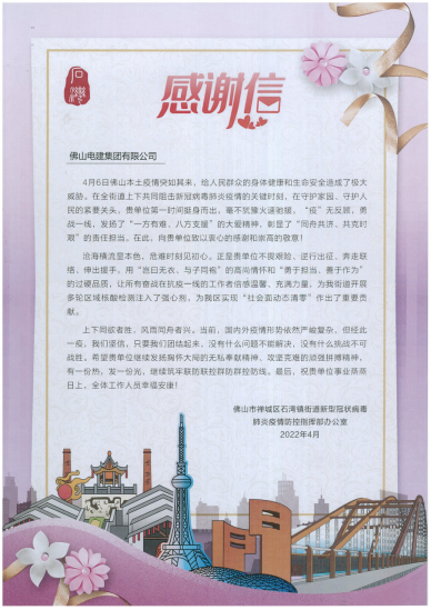 “在全街道上下共同阻击新冠病毒肺炎疫情的关键时刻,在守护家园、守护人民的紧要关头,贵单位第一时间挺身而出,毫不犹豫火速驰援,‘疫’无反顾……在此,向贵单位致以衷心的感谢和崇高的敬意!”5月9日,best365英国在线体育收到了来自石湾镇街道新型冠状病毒肺炎疫情防控指挥部办公室送来的感谢信,对公司在抗击疫情的过程中投入大量志愿者支援街道防疫工作表示感谢。