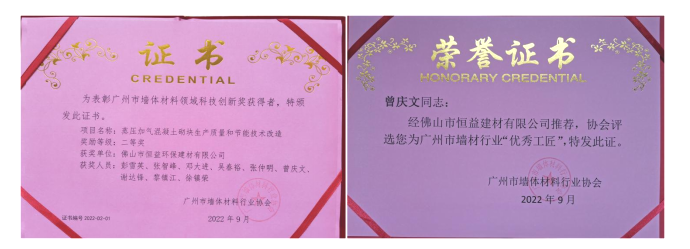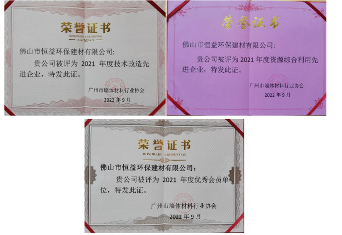 9月27日,经广州市墙体材料协会评选,佛山市恒益环保建材有限公司荣获“2021年度技术改造先进企业”、“2021年度资源综合利用先进企业”、“2021年优秀会员单位”荣誉称号,“蒸压加气混凝土砌块生产质量和节能技术改造” 研发项目获科技创新二等奖,员工曾庆文同志获广州市墙材行业“优秀工匠”称号。