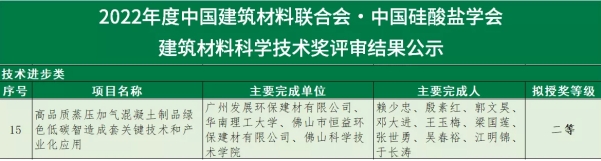 近日,“2022年度中国建筑材料联合会•中国硅酸盐学会建筑材料科学技术奖”公示了评审结果,恒益环保建材公司与广州发展环保建材、华南理工大学、佛山科学技术学院共同参与完成的《高品质蒸压加气混凝土制品绿色低碳智造成套关键技术和产业化应用》项目荣获建筑材料科学技术奖技术进步类二等奖!