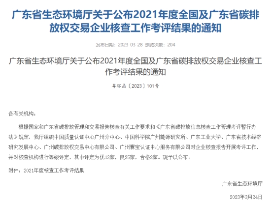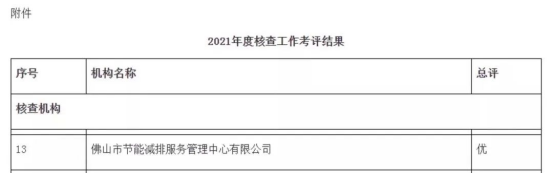 3月24日,广东省生态环境厅发布《广东省生态环境厅关于公布2021年度全国及广东省碳排放权交易企业核查工作考评结果的通知》(粤环函〔2023〕101号),在全省40家核查机构中,节能减排中心作为佛山市唯一一家碳核查机构,2021年度核查工作总评结果为“优”,这是节能减排中心连续第二年被评为优秀碳核查机构。