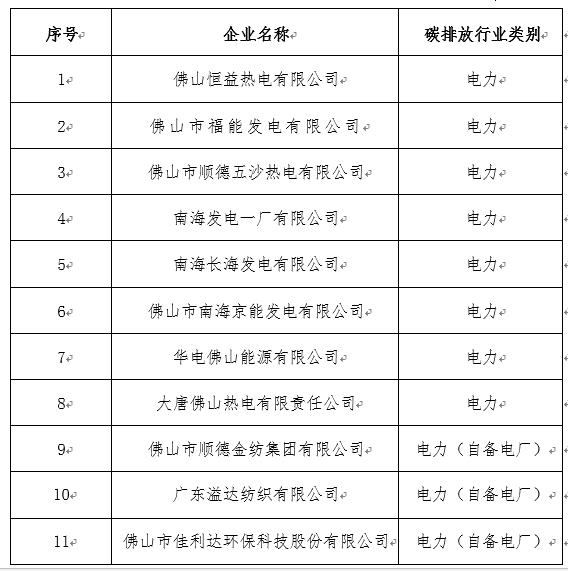 表1 佛山纳入全国碳排放权交易市场配额管理重点排放单位名单