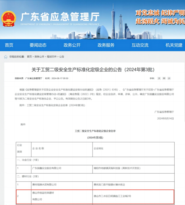 近日,经广东省应急管理厅公告,恒益环保建材公司被评为建材行业二级安全生产标准化企业。