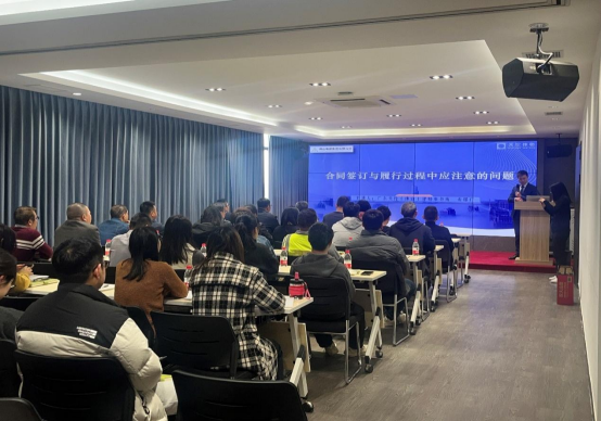 两家公司相关负责人及业务骨干均积极参与,现场气氛热烈。在培训中,律师围绕合同签订前的准备工作、合同签订中的关键条款、合同履行风险防控等核心环节,以及诉讼一般流程,深入浅出地讲解了合同履行过程中可能遇到的各种风险及应对策略,并结合粤构公司及恒益环保建材公司的业务特点,以生动的案例,为参会人员提供了宝贵的实践经验和操作指南。