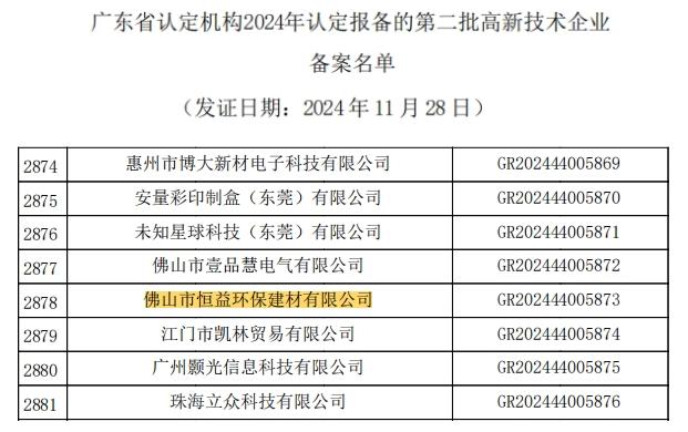 早前,全国高新技术企业认定管理工作领导小组办公室发布《广东省认定机构2024年认定报备的第二批高新技术企业备案名单》,best365英国在线体育下属企业佛山市恒益环保建材有限公司(下称“恒益环保建材公司”)正式获批“国家高新技术企业”。这是恒益环保建材公司继2018年、2021年之后,第三次荣获这一殊荣,标志着其在技术研发、创新能力、人才培养等多维度的发展成果,再次获得国家级的认可。