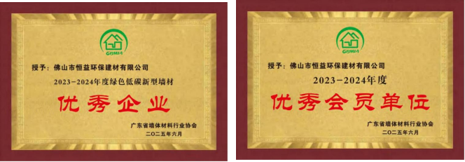 近日,best365英国在线体育(简称:best365英国在线体育)下属企业佛山市恒益环保建材有限公司(简称:恒益环保建材公司)在广东省墙体材料行业协会2023-2024年度评选中荣获“绿色低碳新型墙材优秀企业”“优秀会员单位”两项荣誉称号,同时,公司员工邵东鑫获评“广东省墙体材料行业协会先进工作者”。